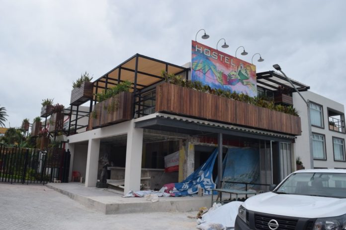 El lugar hoy luce con sellos, pero con actividad normal de hostal, con turistas entrando y saliendo; no obstante, una tubería rota arroja de forma continua agua blancuzca y café directamente hacia la laguna Nichupté.