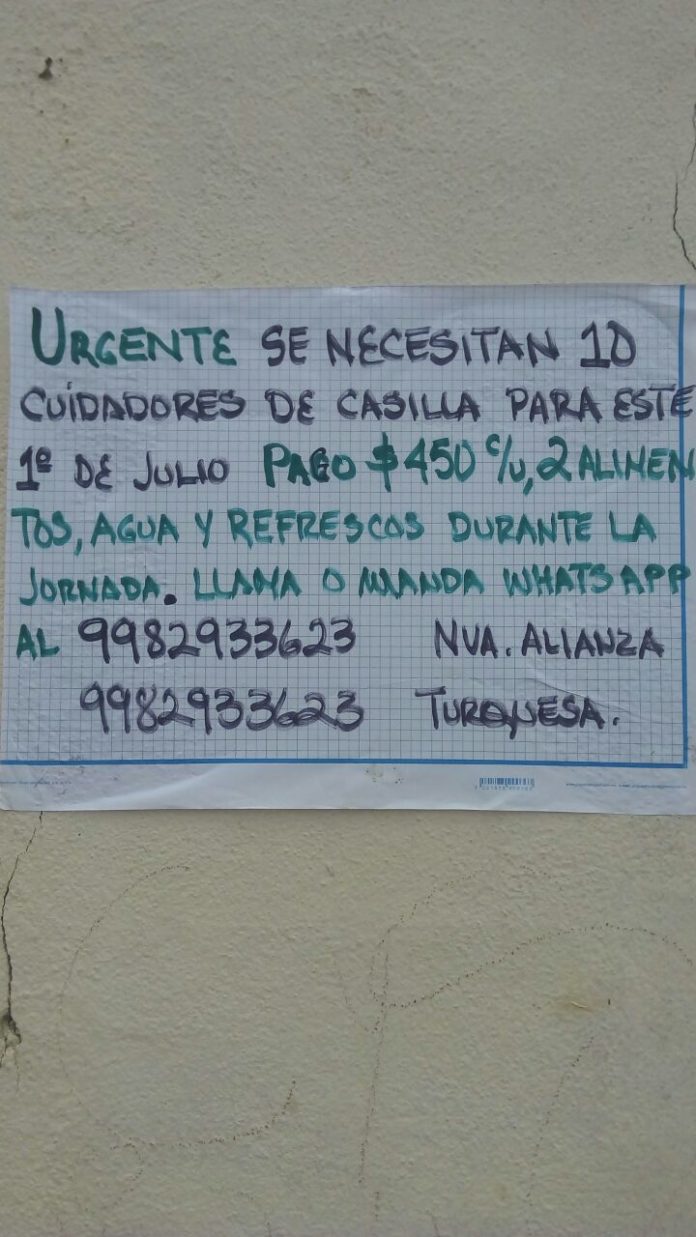 Cancún.- El Partido Nueva Alianza (Panal) busca cuidadores de casilla para la jornada electoral del uno de julio y a cambio ofrece 450 pesos.