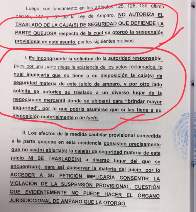 En el resolutivo el juez cita que es incongruente la solicitud de la autoridad responsable, pues por una parte niega la existencia de los actos reclamados, lo cual implica que no tiene a su disposición las cajas y por otro lado solicita su traslado a un diverso lugar de la negociación mercantil donde se ubican, para “brindar mayor seguridad”, lo que implica que sì las tiene a su disposición materialmente o de facto.