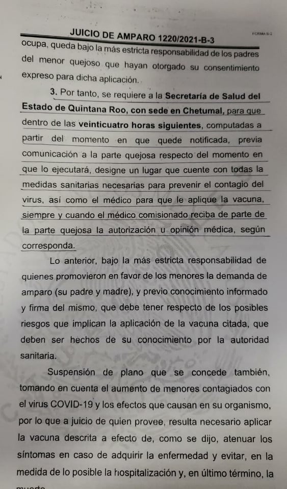 En otras palabras, le ordenan a la Secretaría de Salud de Quintana Roo vacunar a los dos menores en 24 horas después de haber sido notificada; en caso de no acatar la orden judicial, entonces la titular, Alejandra Aguirre Crespo se expone a que la destituyan con un incidente de inejecución de sentencia.