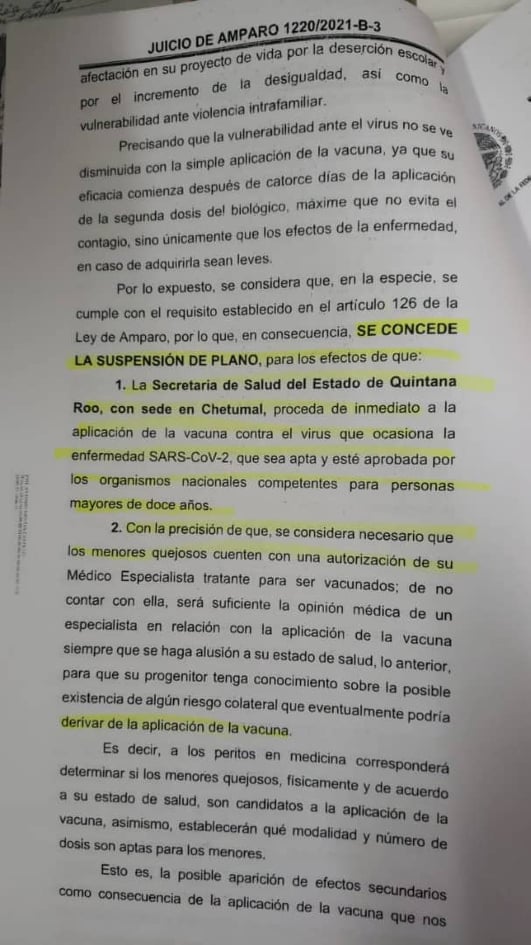 El juez conocedor del caso ordena a la Secretaría de Salud de Quintana Roo, representada por Alejandra Aguirre Crespo, “proceda de inmediato a la aplicación de la vacuna contra el virus que ocasiona la enfermedad Sars-CoV-2, que se apta y esté aprobada por los organismos nacionales competentes para personas mayores de doce años”.