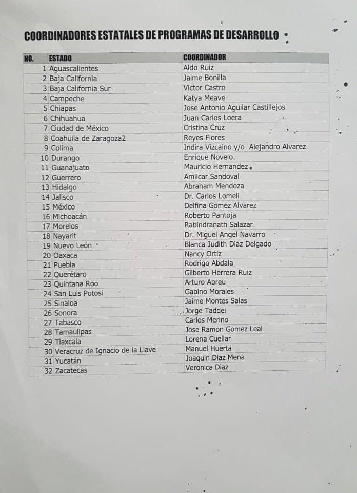 En el caso de Quintana Roo, en la lista aparece Arturo Abreu Marín, quien fungió como enlace de Morena en la zona norte del estado en las pasadas elecciones, con base en Benito Juárez.