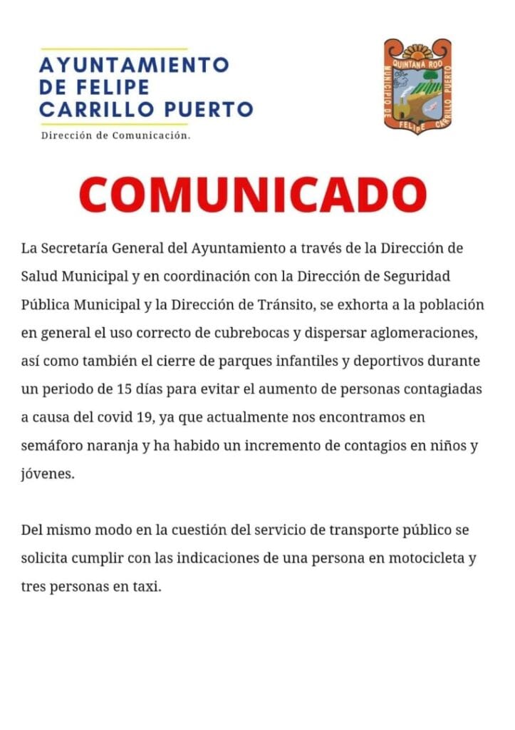 “Así como también el cierre de parques infantiles y deportivos durante un periodo de 15 días para evitar el aumento de personas contagiadas a causa del Covid-19, ya que actualmente nos encontramos en semáforo naranja y ha habido un incremento de contagios en niños y jóvenes”, especifica el anuncio.
