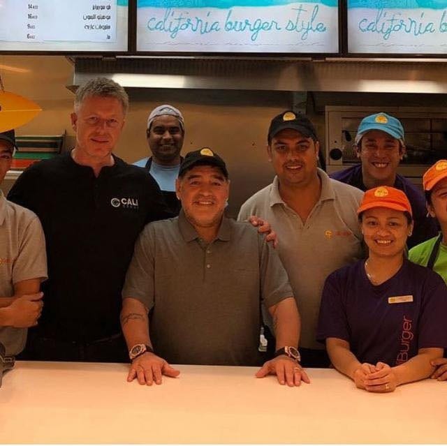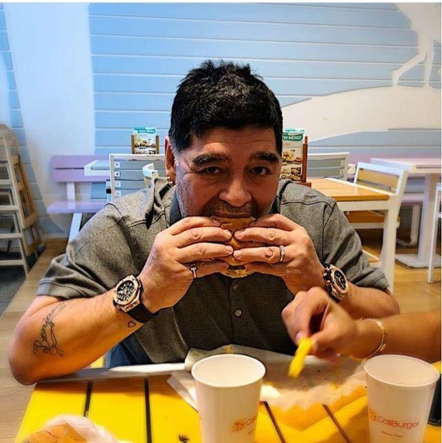 Personal de un restaurante de hamburguesas se encargó de subir fotos del ex mundialista argentino a su red social, mientras disfrutaba una de sus especialidades.