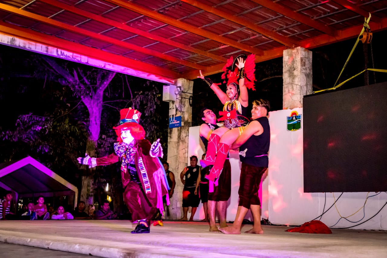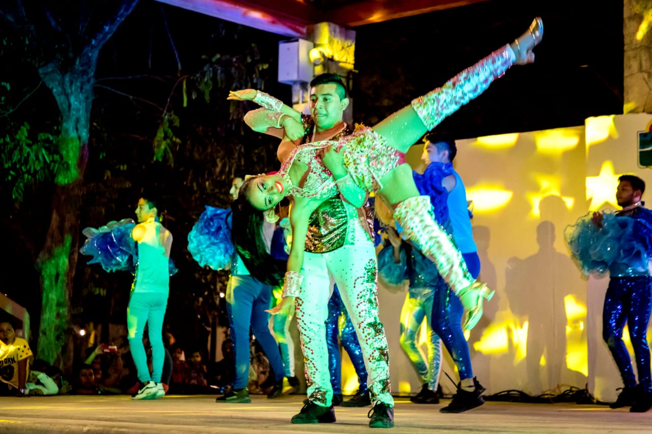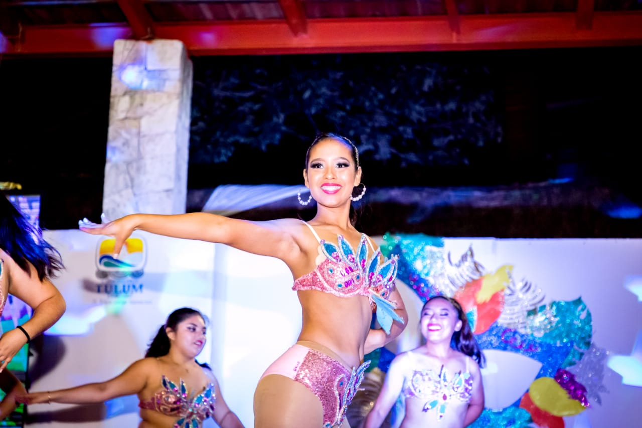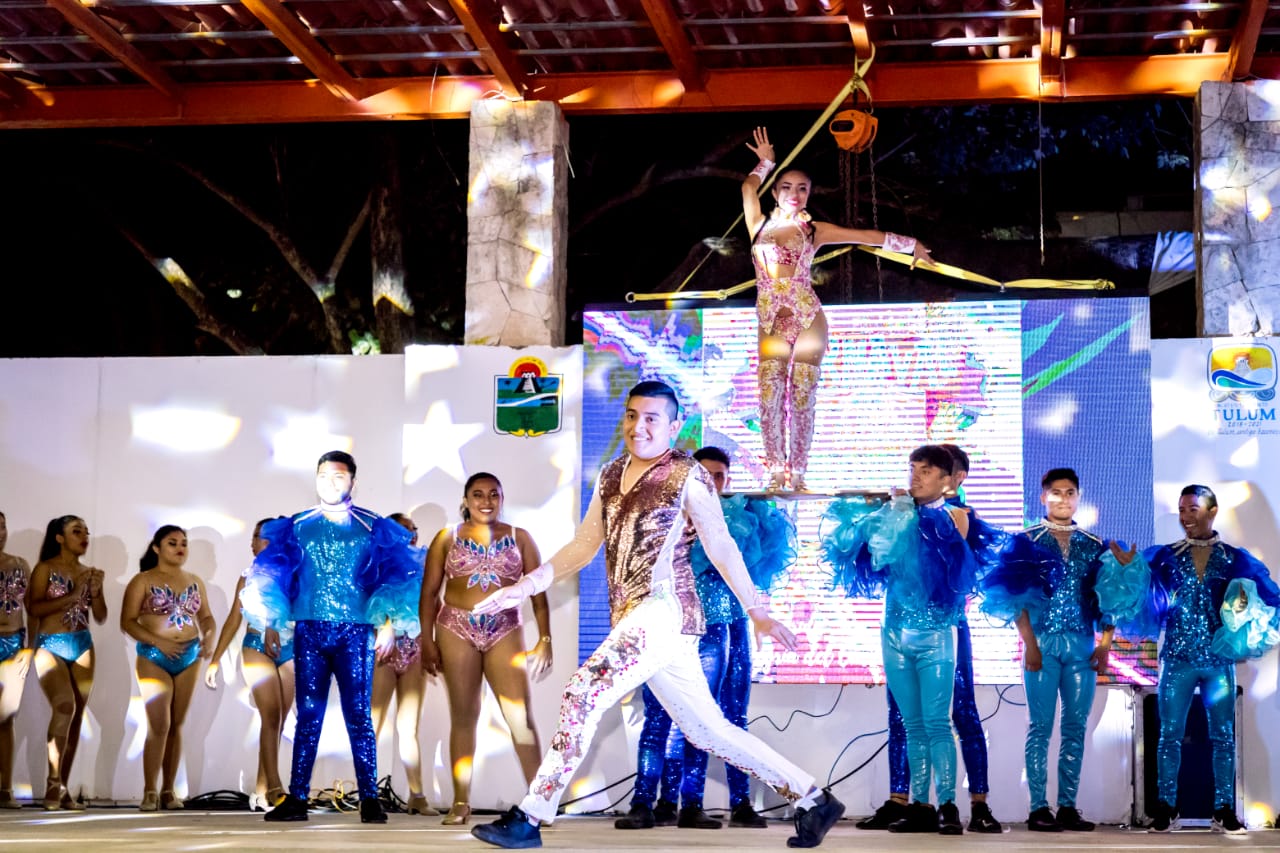 Posteriormente, correspondió la participación de la comparsa integrada por Perla Anahis Xul Fernández y Elmer FelipeYam Uc, procedentes de la comunidad de Akumal, quienes junto con sus bailarines, presentaron una hermosa rutina que generó una gran cantidad de aplausos de los tulumnenses, así como de los turistas nacionales y extranjeros reunidos en el corazón de Tulum, el Parque Museo de la Cultura Maya.