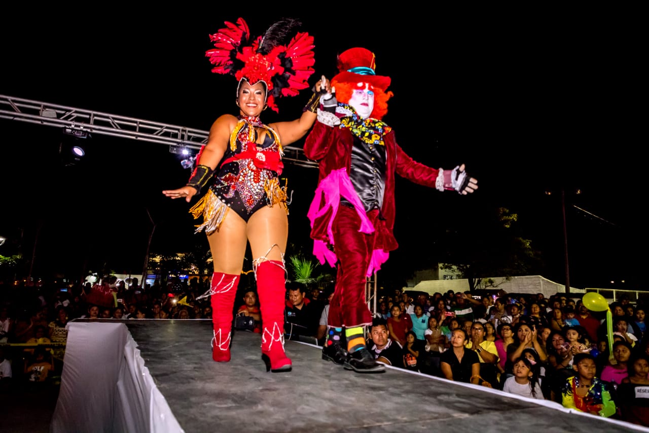 Ante la algarabía de los asistentes, la comparsa encabezada por María Fernanda Torres Vega y Alexis de Jesús Román Díaz, inició su participación, acompañados de un grupo de bailarines, quienes al ritmo caribeño presentaron sus mejores pasos de baile y rutinas, aunado a que contaban con el vestuario adecuado para la ocasión, por lo que recibieron los aplausos de los espectadores.