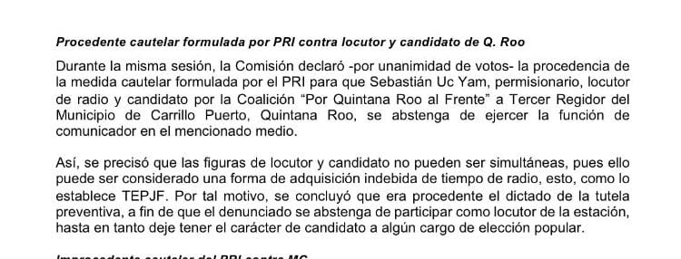 Chetumal.- Consejeros del INE declararon procedente la medida cautelar formulada por el PRI para que Sebastián Uc Yam, permisionario, locutor de radio y candidato de la coalición