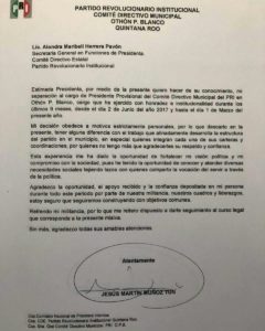 El oficio fue turnado a Alondra Herrera Pavón, secretaria general del tricolor estatal, y quien ejerce la función interina de presidente, en ausencia de Raymundo King de la Rosa, quien dejó el cargo para enfocarse en su candidatura por el Senado de la República.