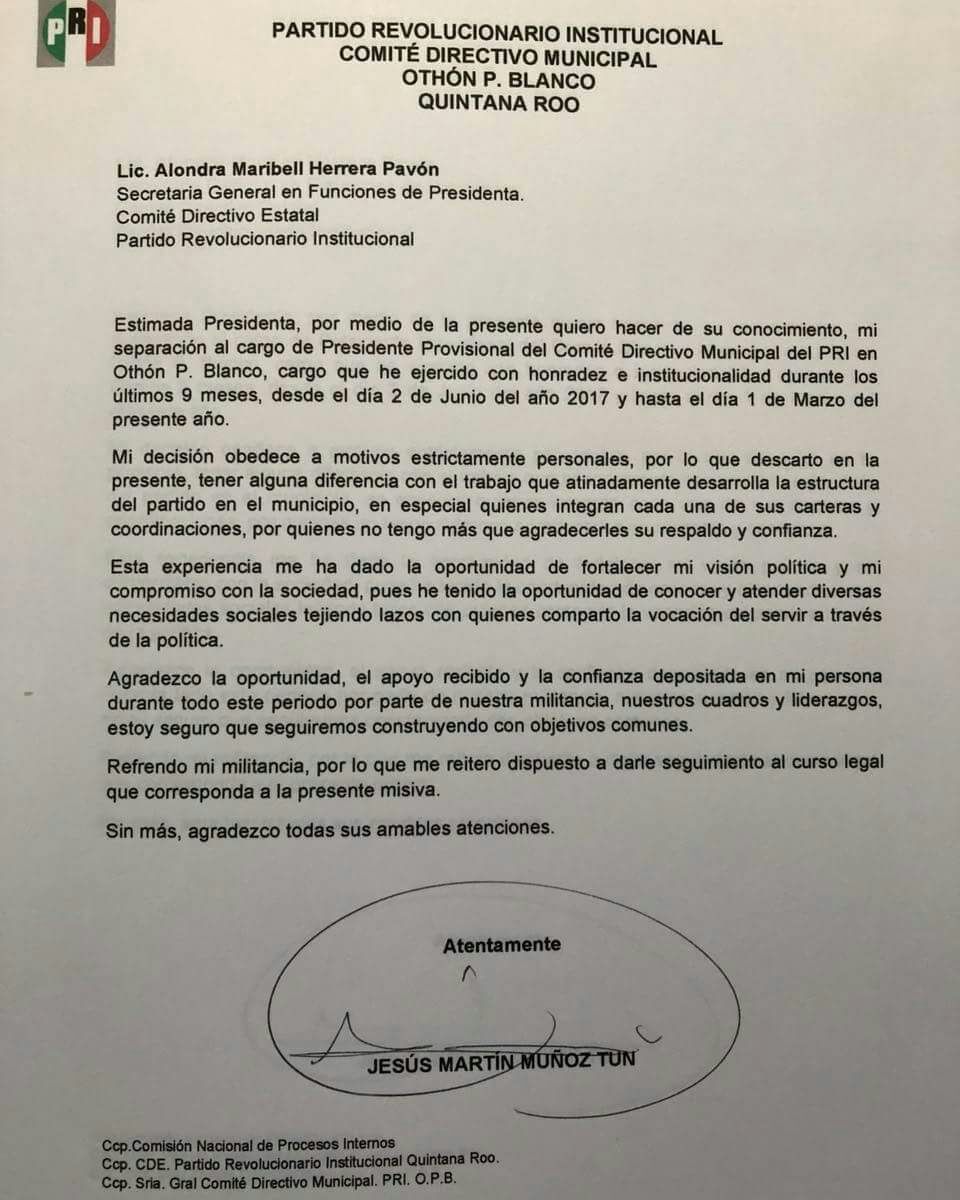 Chetumal.- Por motivos “estrictamente personales”, Martín Muñoz Tun solicitó su separación provisional del cargo como presidente del Comité Directivo Municipal (CDM) del Partido Revolucionario Institucional (PRI) en Othón P. Blanco.