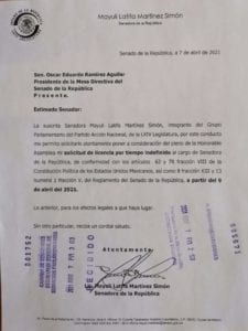 La solicitud corre a partir del día 9 de abril, el documento fue ingresado para que surta efectos de manera inmediata; quien recibió, de acuerdo con el documento exhibido en su página personal de Facebook, fue el senador Óscar Eduardo Ramírez, presidente de la Mesa Directiva del Senado de la República, con base en los artículos 62 y 78, fracción VIII de la Constitución Política de los Estados Unidos Mexicanos.