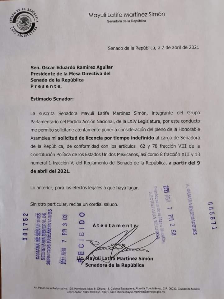 “Quiero compartir una decisión importante. Hoy he pedido licencia como Senadora de la República, porque a partir de este momento, concentraré toda mi energía y entusiasmo en apoyar a la Alianza #VaPorMéxico, *que es * el mejor vehículo que tenemos para hacer un cambio real en nuestro país.