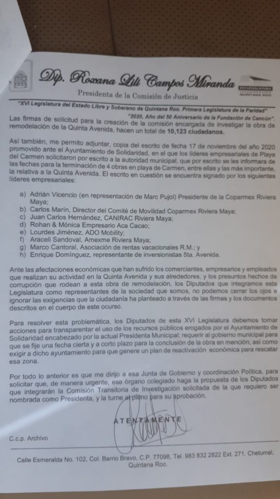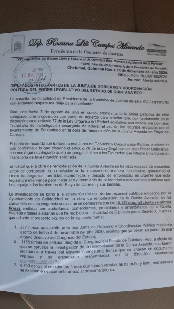 Además de presentar las 10,123 firmas ciudadanas, la diputada Lili Campos incluyó el documento en el cual los líderes de las diferentes cámaras empresariales de Playa del Carmen, solicitan al Ayuntamiento de Solidaridad, informar sobre la fecha de terminación de la Remodelación de esta importante vialidad.
