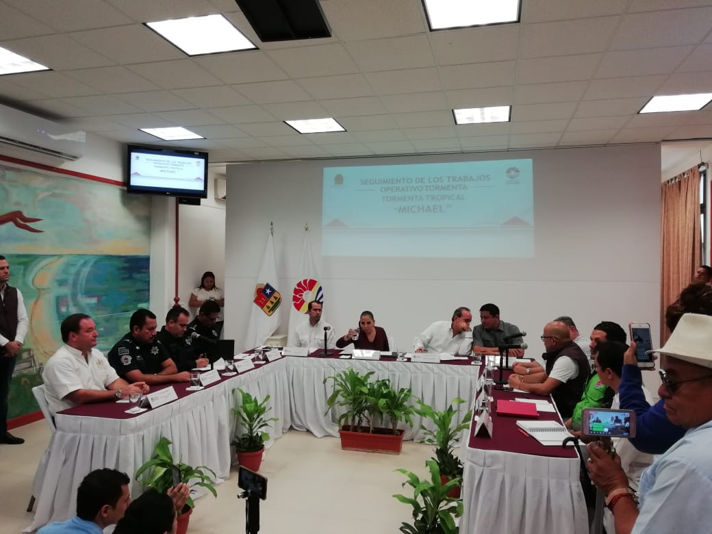 En una rueda de prensa en el Palacio Municipal de Cancún, con la participación de la munícipe, además de Francisco López Mena, secretario de Gobierno, y Jorge Aguilar Osorio, secretario general del Ayuntamiento, entre otras autoridades, se efectuó un enlace por videollamada con el gobernador, quien confirmó el fortalecimiento de la Depresión Tropical 14 a la Tormenta Tropical “Michael”.