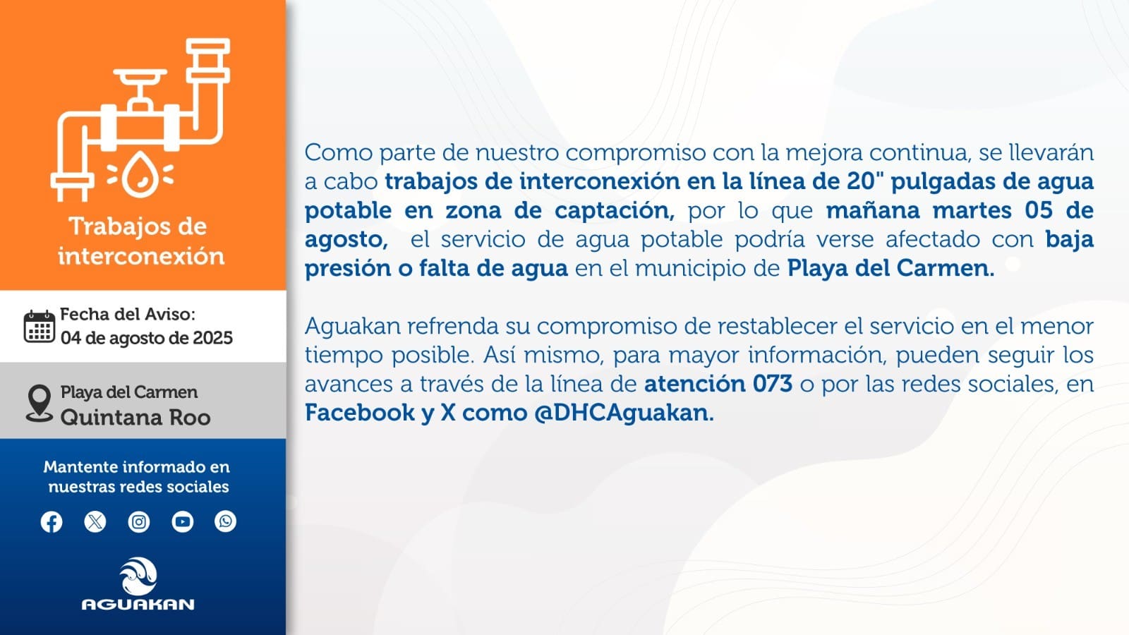 Aguakan informa a la comunidad que el martes 05 de agosto de 2025 se realizarán trabajos de mantenimiento programados de interconexión en la línea de agua potable de 20 pulgadas en zona de captación, por lo que se podría presentar falta de agua en el municipio de Playa del Carmen.