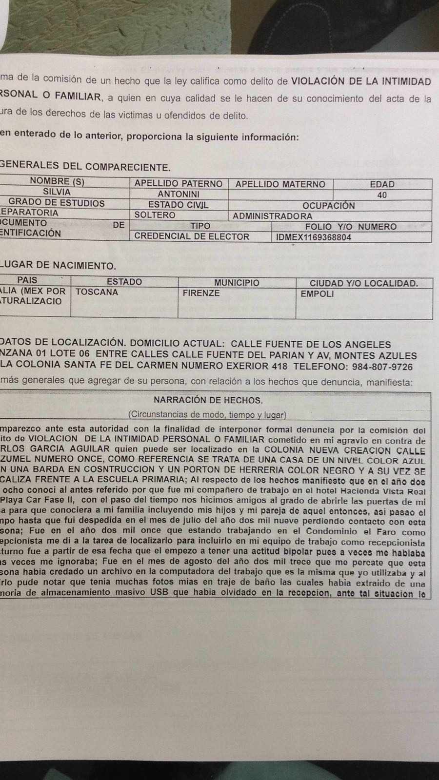 De nacionalidad italiana pero residente en éste destino, solicitó el auxilio de las autoridades. En la averiguación previa, detalla que conoció a Carlos García Aguilar en el año 2008, cuando fue su compañero de trabajo en el hotel Hacienda Vista Real en Playacar.
