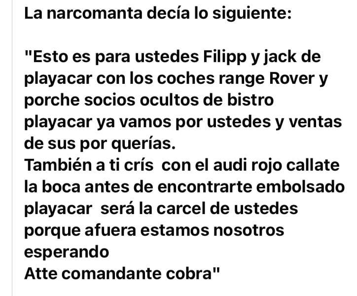 Las advertencias son firmadas por el Comandante Cobra y acusa, al hoy occiso y a los otros dos extranjeros, de controlar el mercado de sustancias dentro del complejo de Playacar.