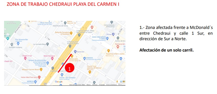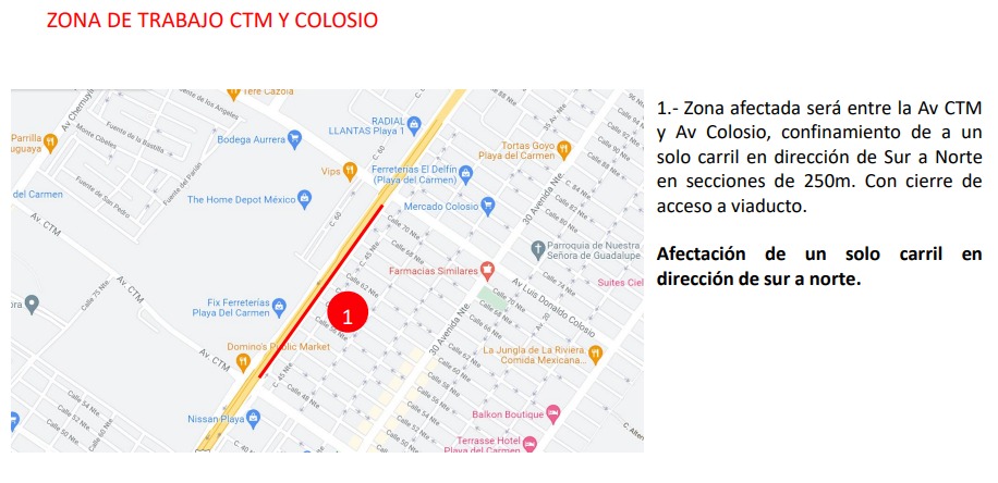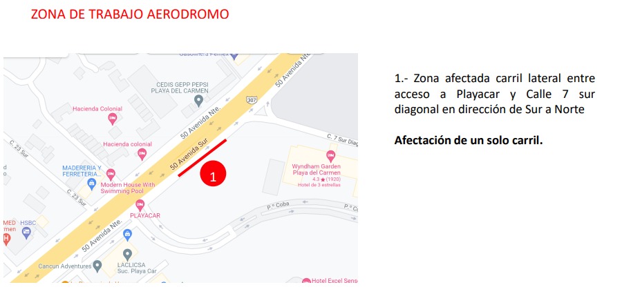 La empresa señaló que en la zona de Centro Maya se afectará el carril lateral, frente a la calle 29 Sur, en dirección de sur a norte, mientras que en el área del aeródromo se suspenderá la circulación en el carril lateral, entre el acceso a Playacar y la calle 7 sur diagonal, también de sur a norte.