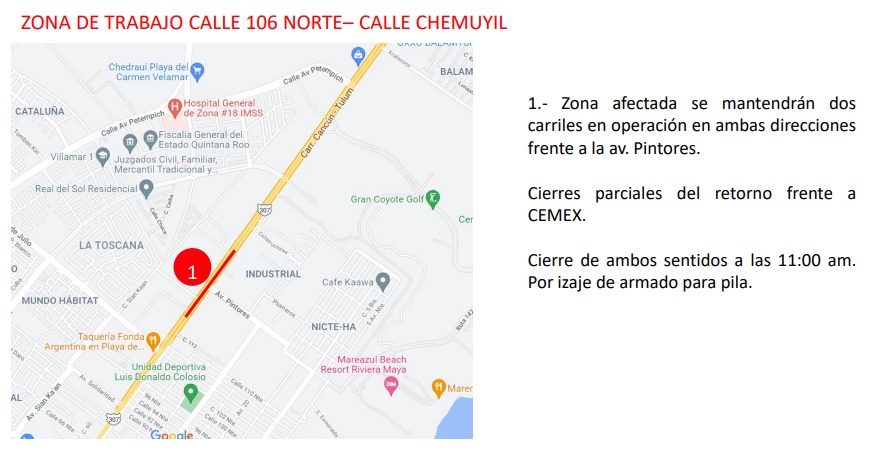El último punto que se verá afectado es en la calle 106 norte con Chemuyil. Ahí se mantendrán dos carriles en operación en ambas direcciones, frente a la avenida Pintores, con cierres parciales del retorno frente a CEMEX y bloqueo de ambos sentidos a las 11:00 de la mañana, por izaje de armado para pila.