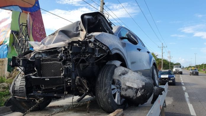 Playa del Carmen.- Un accidente sobre la carretera federal en el tramo Playa del Carmen-Tulum, ha dejado una persona lesionada y una fila de 500 metros de autos esperando para poder cruzar. Dos autos quedaron prácticamente destrozados.