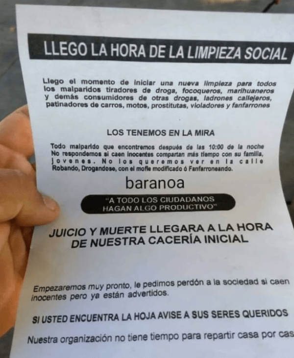 El volante que advierte hacer una “limpieza social”, es originalmente del municipio de Barona en Colombia, que según el medio local “La Libertad”, las autoridades colombianas ya investigan el documento para dar con la procedencia del mismo.