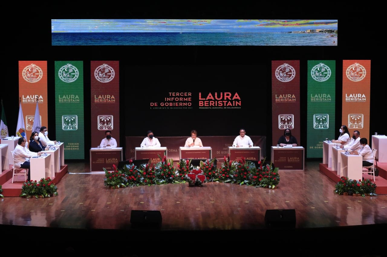 Playa del Carmen, Quintana Roo, a 13 de septiembre de 2021.- “El primer gobierno de la Cuarta Transformación en Solidaridad, ha creado cimientos promisorios, a fin de avanzar hacia un modelo de desarrollo sostenible, siguiendo el prisma de nuestra propia Agenda 2030 Local, la ruta de la justicia y el bienestar social”, destacó la presidenta Laura Beristain Navarrete al presentar su tercer informe de gobierno ante los ciudadanos solidarenses.