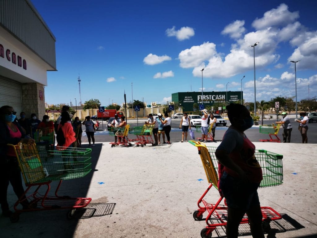 Playa del Carmen.- El aforo permitido dentro de los supermercados de la ciudad ha sido reducido todavía más, a apenas 50 personas en algunas de estas sucursales y solo si llevan cubrebocas, situación que genera esperas en las afueras de las mismas.