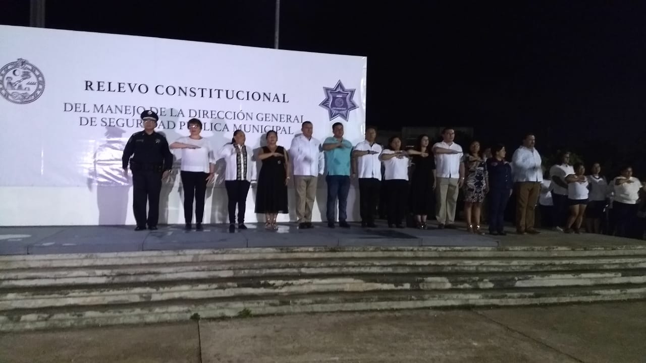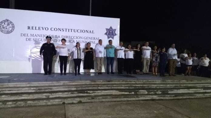 En la ceremonia solemne de cambio de mando, efectuada en las instalaciones policiacas municipales, le edil saliente y electa, María Cristina Torres Gómez y Laura Esther Beristain Navarrete, respectivamente, atestiguaron la presentación del nuevo jefe policiaco.