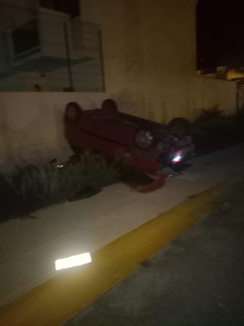 Playa del Carmen.- Cerca de las 12:35 de la mañana, la policía de Solidaridad recibió un reporte de un accidente vial en Seboruco, donde un automovilista perdió el control de su auto al dar vuelta en la glorieta.