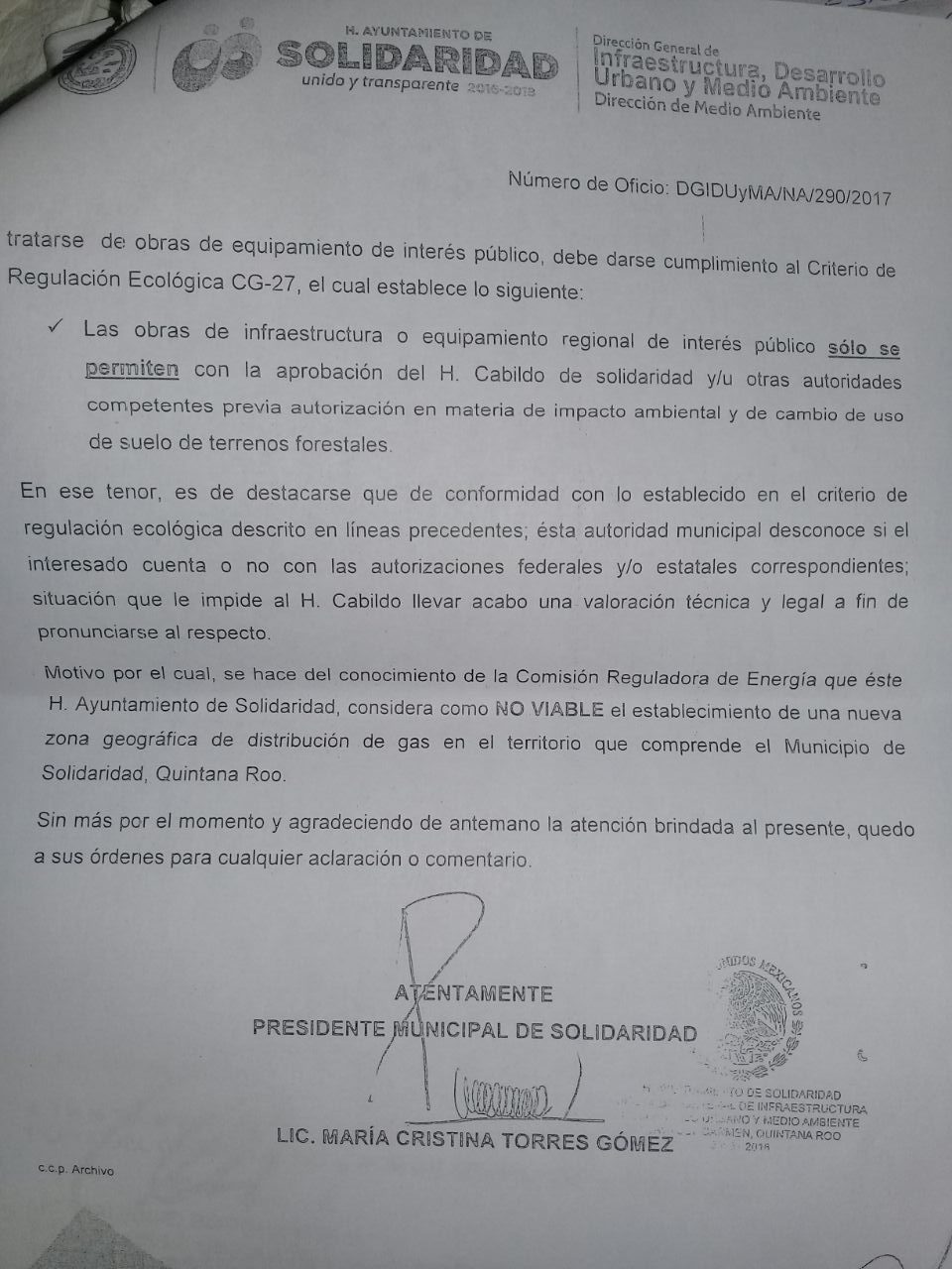 “Se hace del conocimiento de la Comisión Reguladora de Energía que este H. Ayuntamiento de Solidaridad, considera como NO VIABLE el establecimiento de una nueva zona geográfica de distribución de gas en el territorio que comprende el Municipio de Solidaridad, Quintana Roo”, concluye el informe.