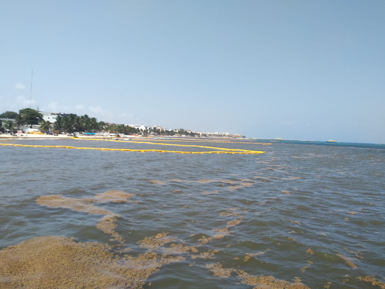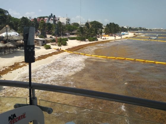 Playa del Carmen.- Esta mañana en las costas de Playa del Carmen se pudo presenciar altas cantidades de sargazo a pesar de estar instaladas las barreras de la empresa Ar.Co.