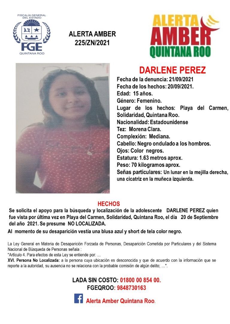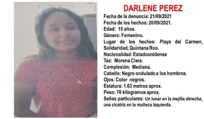 Playa del Carmen.- Autoridades locales han emitido una Alerta Amber para localizar a Darlene Pérez, joven de 15 años de nacionalidad estadounidense, quien desapareció en Playa del Carmen hace dos días.