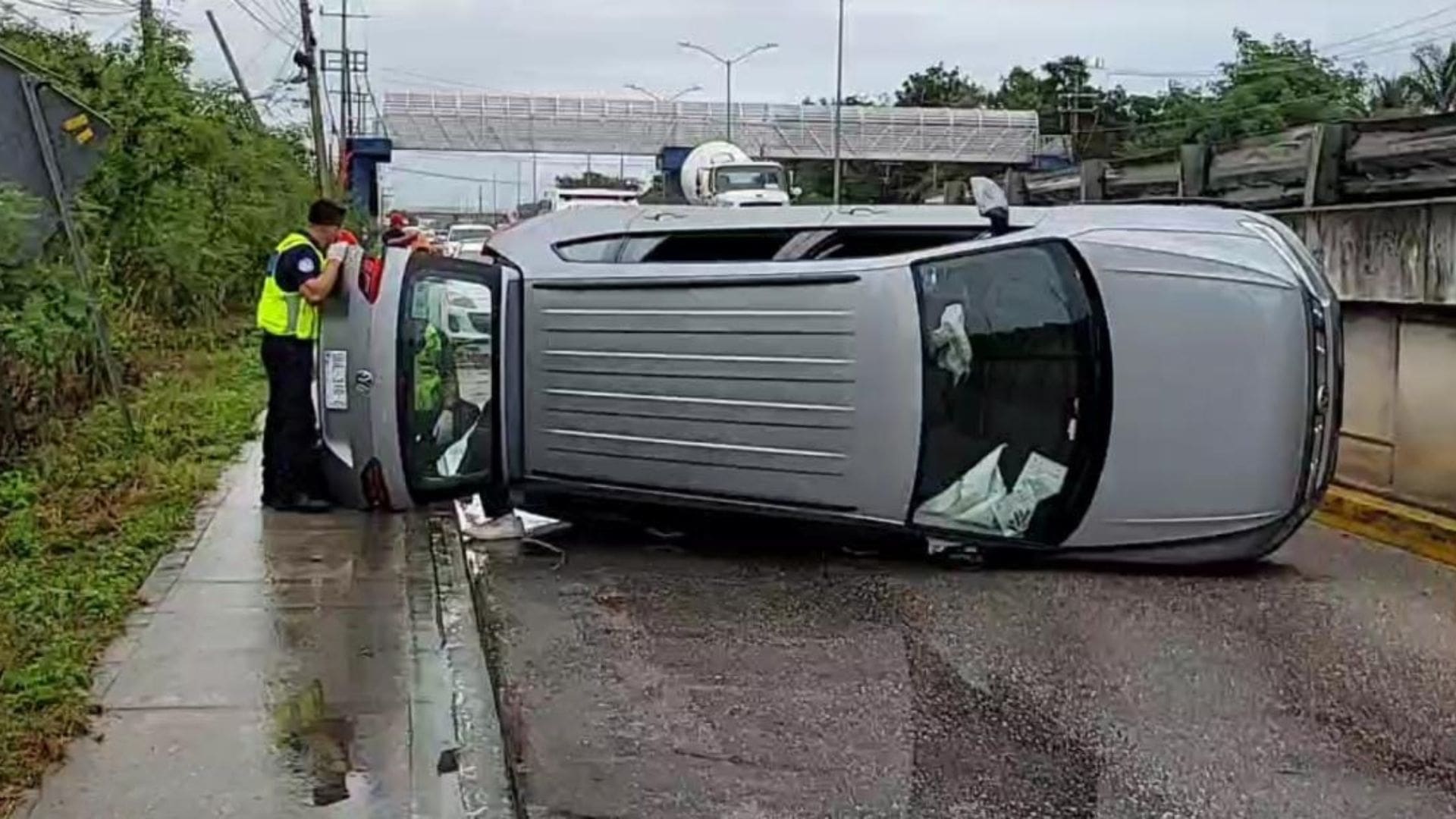 Playa del Carmen.- Una camioneta cayó del puente de Puerto Aventuras de la carretera federal 307 y quedó volcada en el carril lateral.