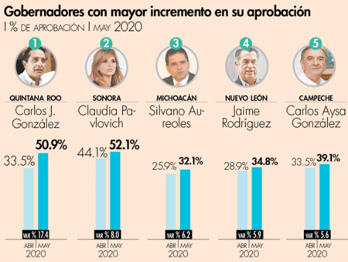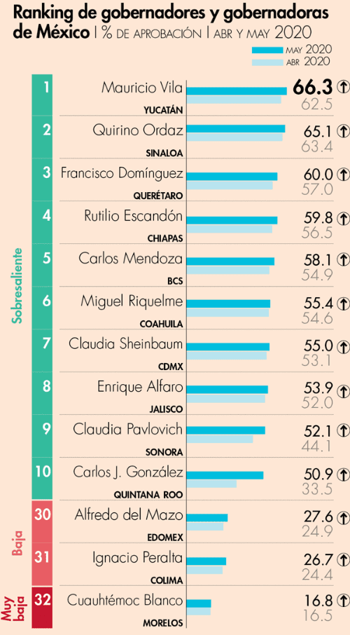 Por su parte, la encuesta correspondiente a mayo y que desde agosto del año pasado mide mensualmente el desempeño de los gobernadores calificó a los de Yucatán, Sinaloa, Querétaro, Chiapas, Baja California Sur, Coahuila, Ciudad de México, Jalisco, Sonora y Quintana Roo con una aprobación “sobresaliente’’.