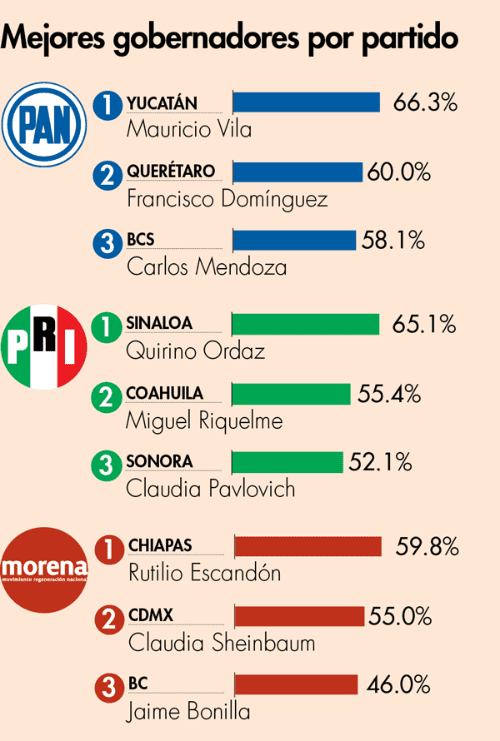 Asimismo, la encuesta revela que el partido con más alta aprobación fue con los gobernadores del PAN, que obtuvieron (primero, tercero, quinto y décimo lugar), mientras que el PRI (segundo, sexto y noveno), dos de Morena (cuarto y séptimo) y el único de MC (octavo).