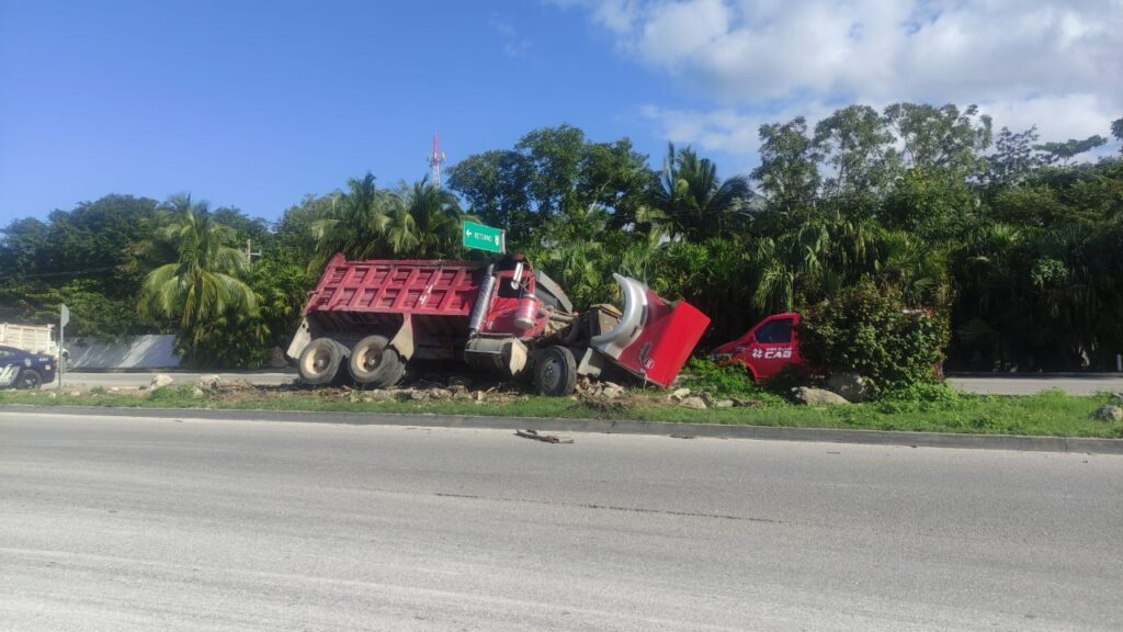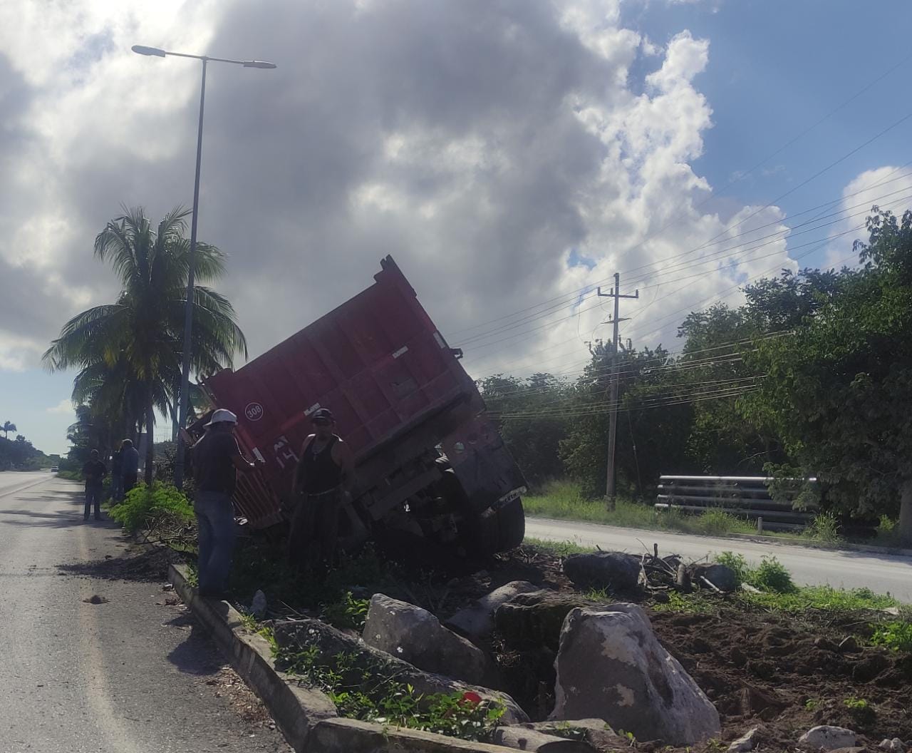 Playa del Carmen.- Un pesado camión cargado de asfalto se salió de la carretera federal 307, entre Playa del Carmen y Tulum, quedando atorado en el camellón central, afortunadamente sin lesionados.