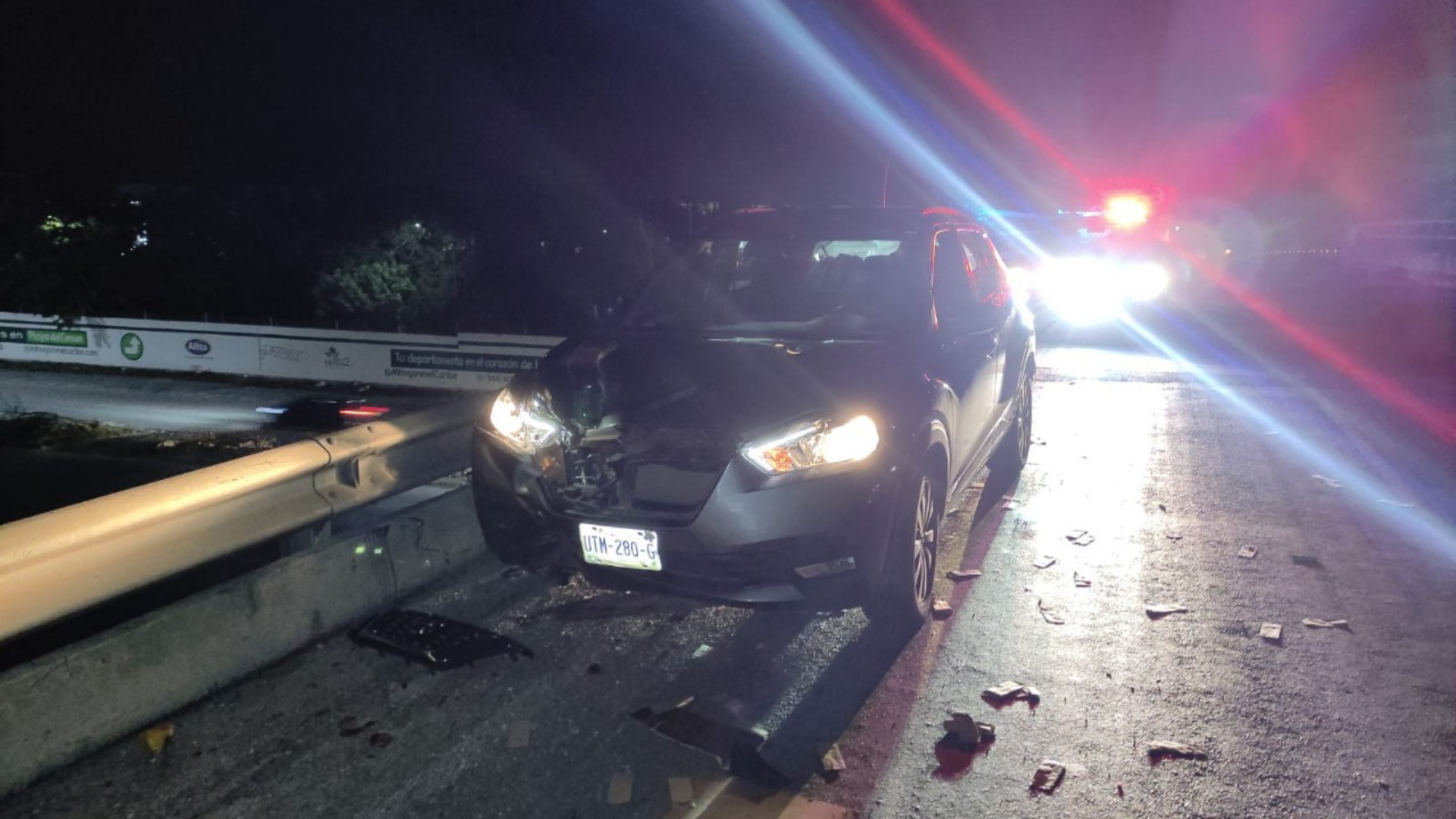 Playa del Carmen, Q. Roo.- La madrugada de este lunes una camioneta se estrelló contra una motocicleta y casi tira a su conductor desde arriba del puente vehicular de Real Ibiza, sobre la avenida Colosio.