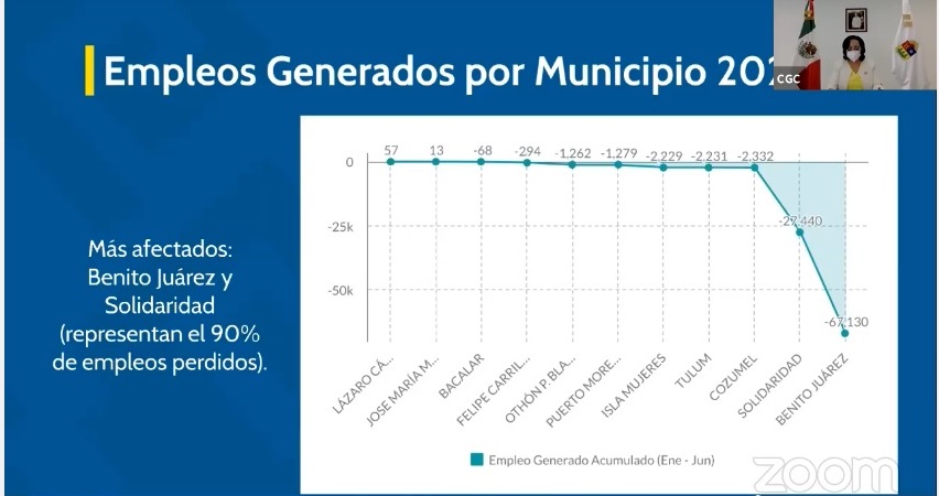 Especificó que los trabajadores más afectados son los de municipios de Benito Juárez (Cancún) y Solidaridad (Playa del Carmen), lo que representa el 90 por ciento; en el primero van 62 mil 130 empleos perdidos y en el segundo es de 22 mil 440.