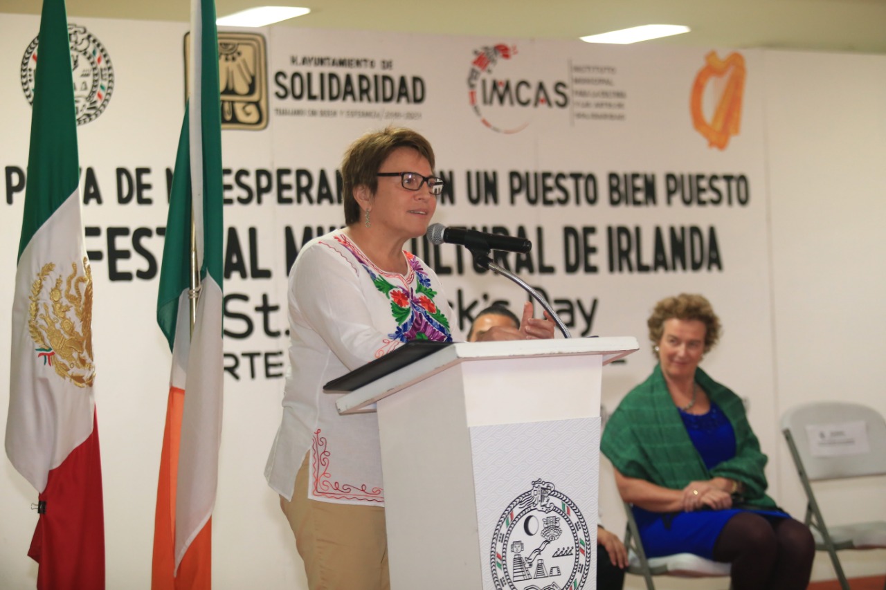 Playa del Carmen.- Acompañada por la embajadora de Irlanda en México, Bárbara Jones, la presidenta municipal de Solidaridad, Laura Beristain Navarrete, celebró la noche del sábado el Día de San Patricio en la Plaza 28 de Julio, la cual concluyó con gran éxito.