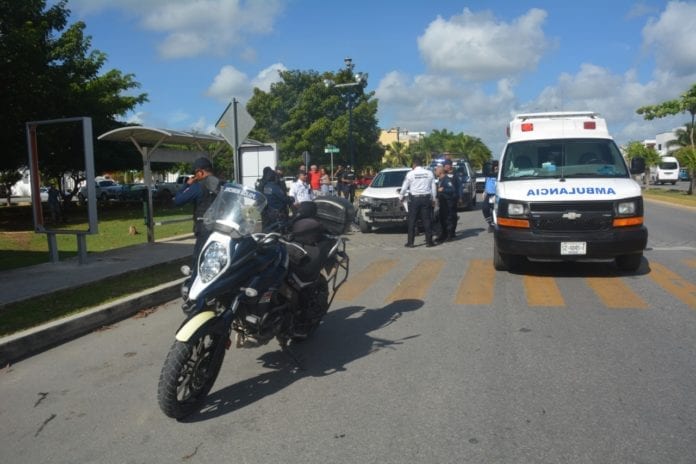 Playa del Carmen.- Un agente de la Policía Municipal quedo con fractura de pierna, luego de estrellarse en contra de un automóvil sobre la avenida Colosio, cuando respondía a un llamado por un robo a un comercio.