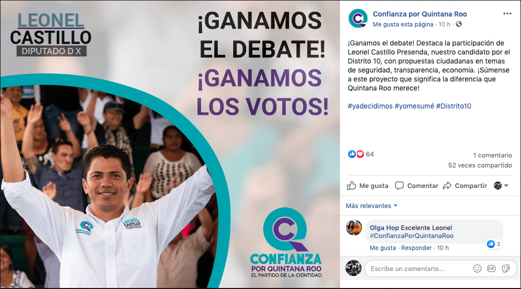 “¡Ganamos el debate! Destaca la participación de Leonel Castillo Presenda, nuestro candidato por el Distrito 10, con propuestas ciudadanas en temas de seguridad, transparencia, economía. ¡Súmense a este proyecto que significa la diferencia que Quintana Roo merece!”, escribió el partido.
