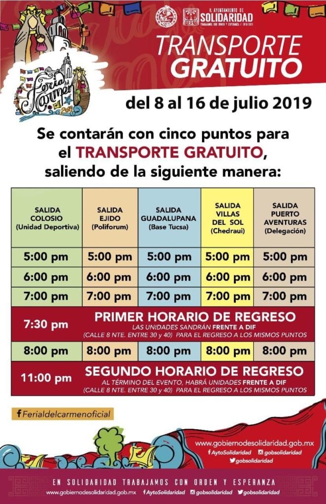 Es importante mencionar que con la finalidad de que nadie se quede sin disfrutar de los conciertos en vivo y todas las actividades, se dispuso de transporte gratuito –ida y vuelta-, durante todos los días que dure la feria, de las colonias Colosio, Ejido, La Guadalupana, Villas del Sol y la delegación de Puerto Aventuras, con dirección a la Plaza Cívica “28 de Julio”.
