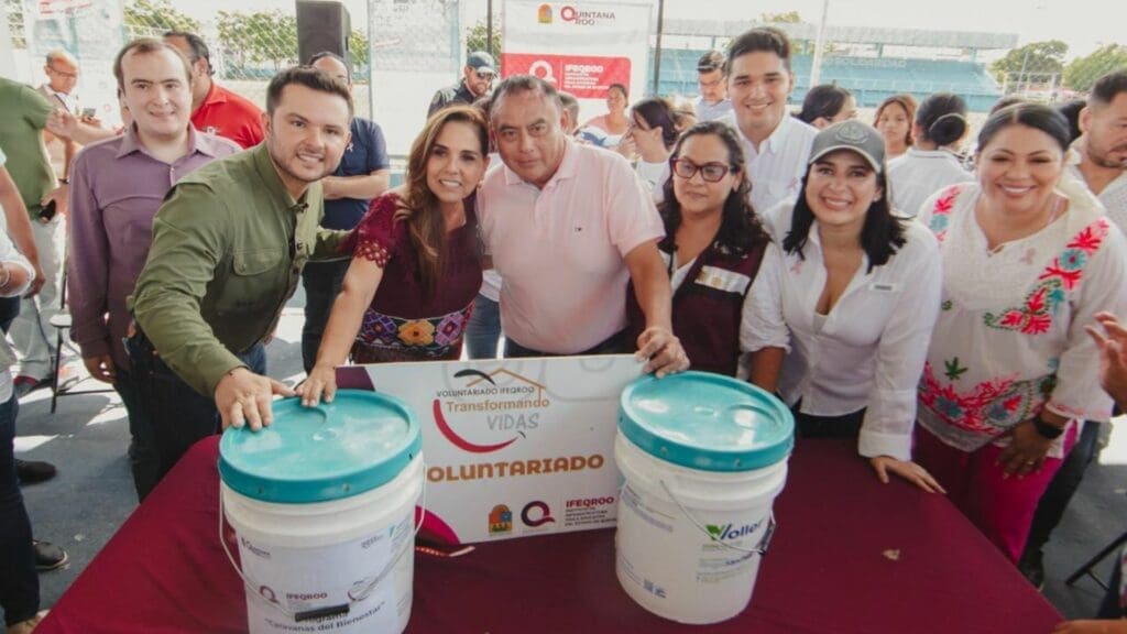 Antes, Estefanía Mercado acompañó a la gobernadora Mara Lezama en el evento de entrega de sillas de ruedas, tinacos, triciclos, bicicletas, botes de pintura y servicios de acompañamiento para trámites de Actas de Nacimiento, Antecedentes No Penales, servicios de salud, educación y becas, entre otros, que tuvo lugar en la Unidad Deportiva Luis Donaldo Colosio.