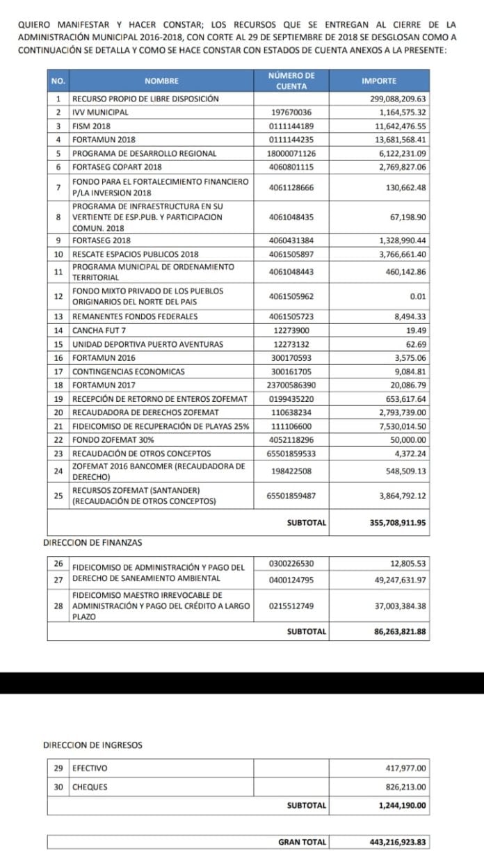 Lo anterior representa que el del 100 por ciento de los recursos entregados, 299 millones 088 mil 209 pesos son de libre disposición y 144 millones 127 mil 981 pesos corresponden a inversión municipal de obras públicas, fondos federales etiquetados, del Fideicomiso del Derecho de Saneamiento Ambiental (FDSA), entre otros.