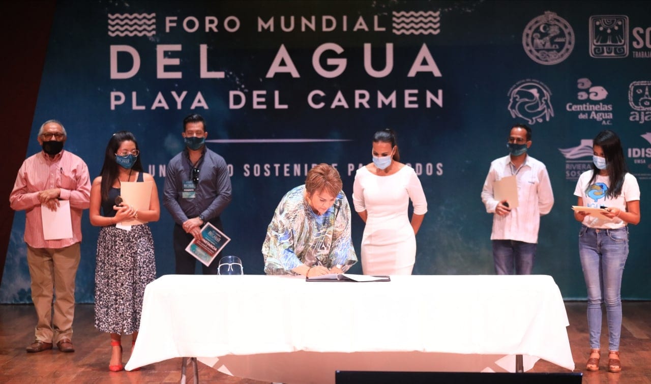 Playa del Carmen, Quintana Roo, a 23 de marzo del 2021.- Con la firma de la “Carta de Intención de la Tierra”, culminó con éxito el Foro Mundial del Agua en el Teatro de la Ciudad, en donde la presidenta municipal Laura Beristain Navarrete, en compañía de distintas autoridades de los tres órdenes de gobierno, panelistas y expertos en temas del agua y los acuíferos, reafirmaron su compromiso de promover acciones y programas enfocados a propiciar el desarrollo sustentable cuidando los ecosistemas para proteger toda forma de vida, en donde el ser humano pueda gozar del derecho al vital líquido pero con un consumo responsable.