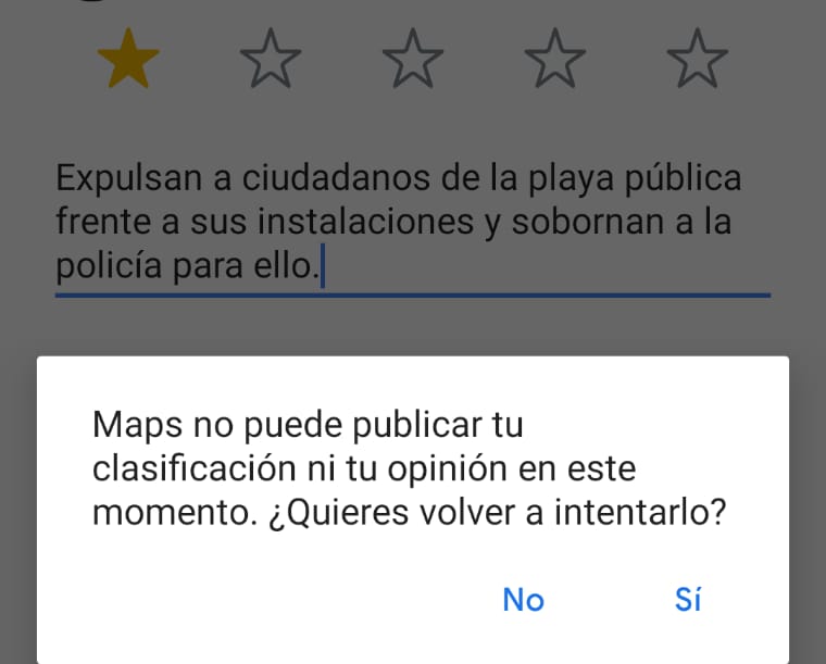 También Google acumula reseñas ingresadas en su programa Maps, las que también fueron suspendidas para Mamita’s. En su caso, simplemente arroja un mensaje de error, sin detallar los motivos por el que ya no se permite adjuntar opiniones.