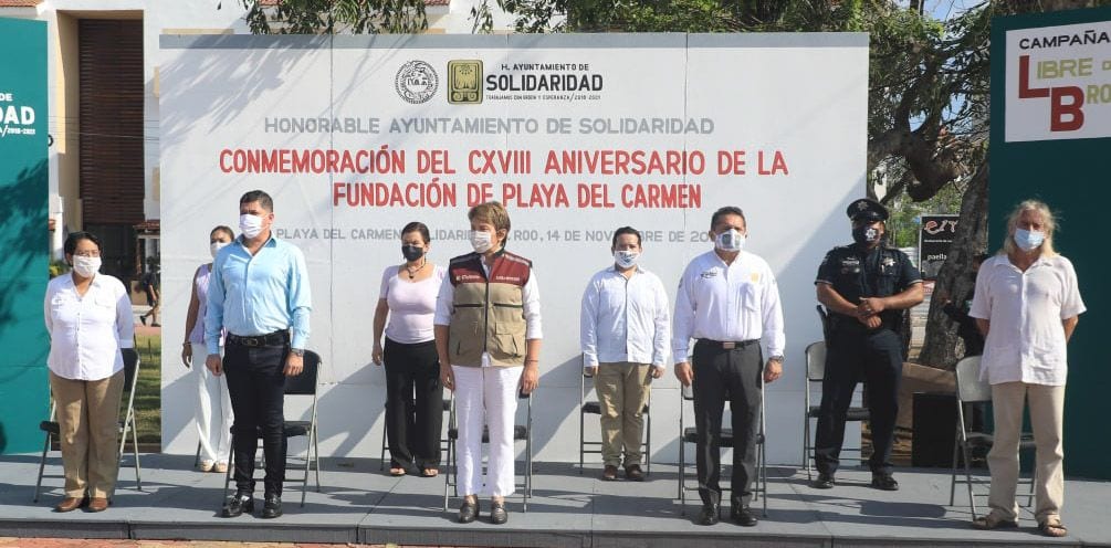 Playa del Carmen, Solidaridad.- Con una ceremonia cívica en la plaza del Ayuntamiento de Solidaridad, la presidenta municipal, Laura Beristain Navarrete, junto al cronista de la ciudad, Raymundo Tineo Celaya, fundadores de la ciudad y ciudadanía, conmemoraron esta mañana los 118 años de creación de este polo turístico que es hoy una de las ciudades más importantes en el país y corazón de la Riviera Maya.
