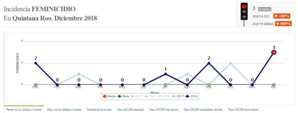 El Secretariado Ejecutivo del Sistema Nacional de Seguridad Pública (SESNSP) brinda las cifras oficiales en incidencia delictiva y para 2018, marca 8 feminicidios en Quintana Roo, de un total de 834 casos a nivel país. Con estas cifras, la entidad figura como la novena con menor incidencia, aunque en el índice por cada 100 mil casos, sube de número 23 al número 18 en el ranking.