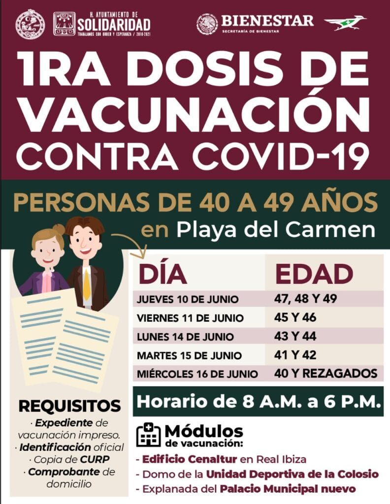 Playa del Carmen, Quintana Roo, a 13 de junio del 2021.- Este lunes 14, martes 15 y miércoles 16, la Secretaría del Bienestar, con el apoyo logístico del Gobierno de Solidaridad que encabeza Laura Beristain Navarrete, continuará con la jornada de aplicación de la primera dosis de la vacuna contra la Covid-19 a personas de 40 a 49 años de edad, madres embarazadas, y adultos de más edad que aún no han sido inmunizados.