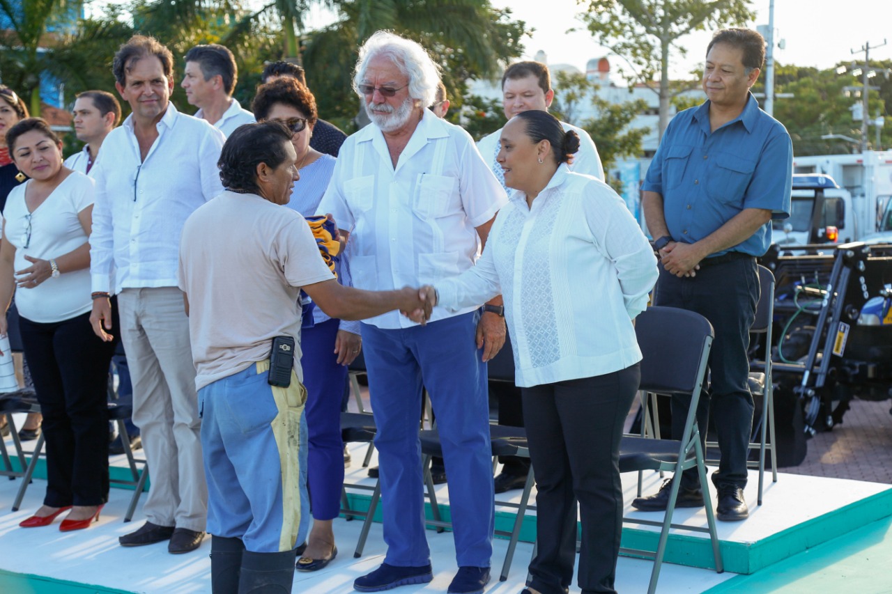 Durante una histórica entrega de 43 unidades de parque vehicular nuevas con 11 accesorios, que pasan a ser propiedad del Ayuntamiento, los cuales fueron adquiridos con recursos del Fideicomiso del Derecho al Saneamiento Ambiental (FDSA) para reforzar los trabajos de retiro del sargazo y recoja de basura, la Munícipe destacó que este logro es el resultado del trabajo en conjunto entre el Gobierno Municipal, la iniciativa privada y el sector educativo, por lo cual les manifestó su reconocimiento y agradeció su confianza.