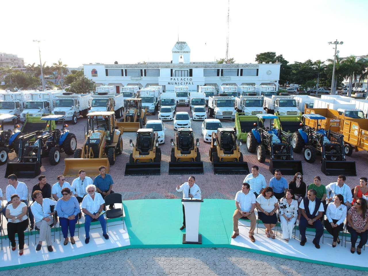 Durante el evento al que asistieron representantes del sector hotelero, restaurantero, educativo, colegios y organizaciones civiles, fueron entregados: ocho camiones de redilas, dos equipos de perforación con taladro y compresor, 20 vehículos recolectores de residuos sólidos urbanos (15 camiones y cinco volquetes), tres barredoras de playa, cinco vehículos compactos, dos retroexcavadoras, tres minicargadores, cuatro tractores agrícolas, cuatro pala cargadora frontal y dos remolques hidráulicos, así como un cargador comácto para la ZOFEMAT.